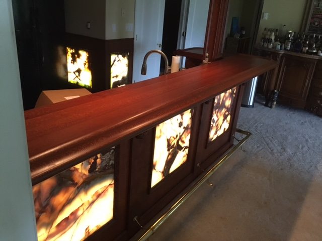 After stain and four coats of polyurethane the bar rail I received from you is finished. I appreciate the accurate measurements on the website since I built the bar before receiving your materials. Every piece fit together perfectly which was important since I had two 90 degree and two 45 degree turns to make.